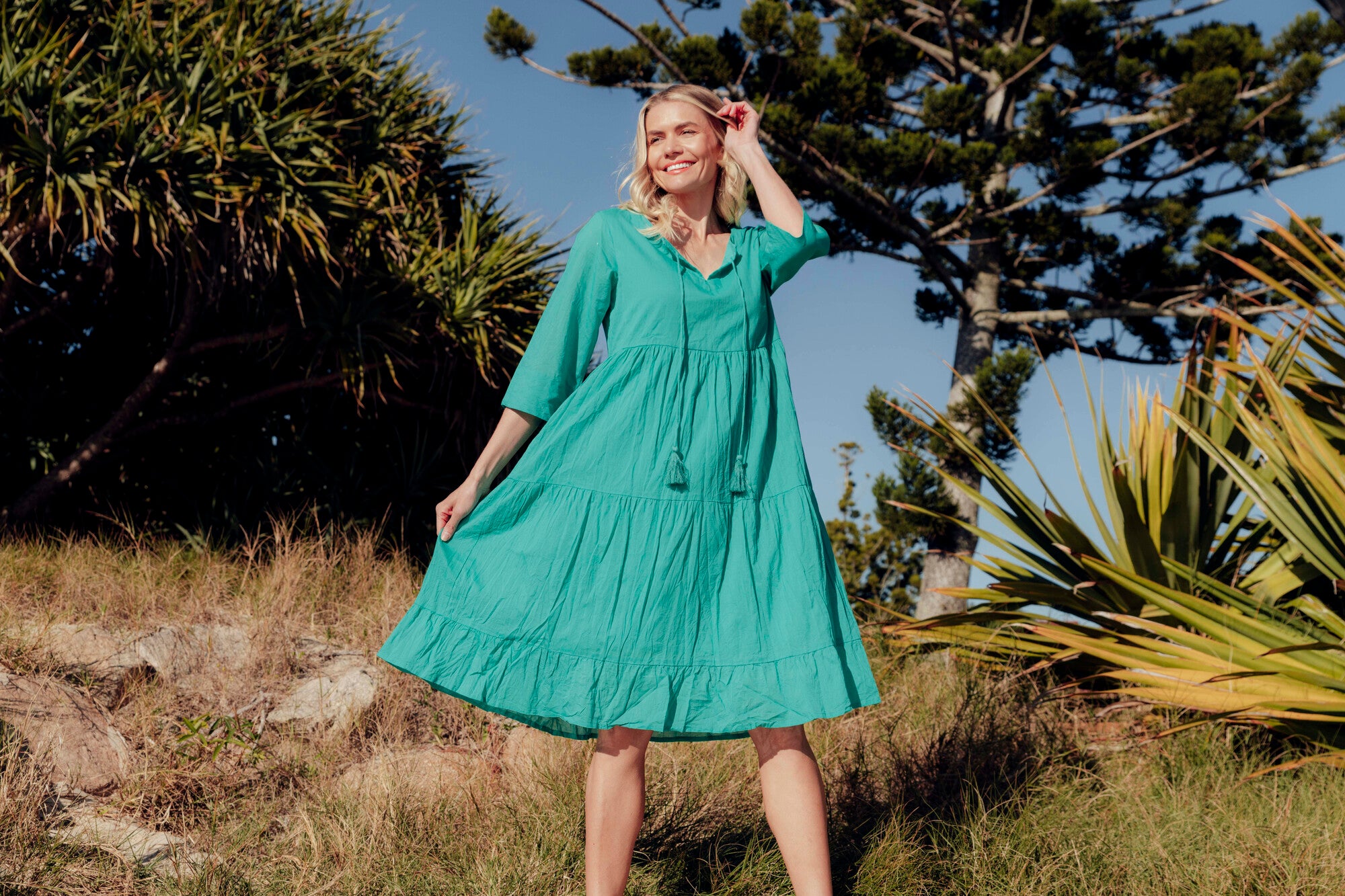 Welcome summer in style, with our vibrant Amber dress crafted from 100% cotton. Featuring breezy 3/4 sleeves and playful tassel detailing, it is perfect for sun-soaked days. Available in seasonal block colours, this dress effortlessly combines comfort and fashion for your sunny adventures.