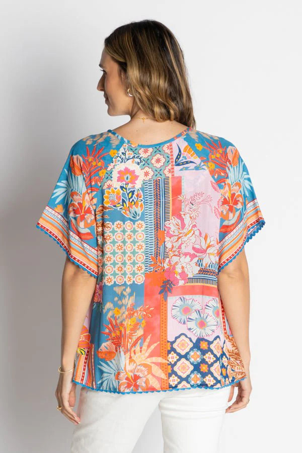The Asmara Top in Ocean features a flattering v-neck and short sleeves adorned with delicate ric rac detailing around the edges. Its relaxed fit ensures comfort and effortless style, making it an ideal choice for warm days or layering. The intricate trim adds a subtle, artisanal touch that elevates this versatile wardrobe staple.