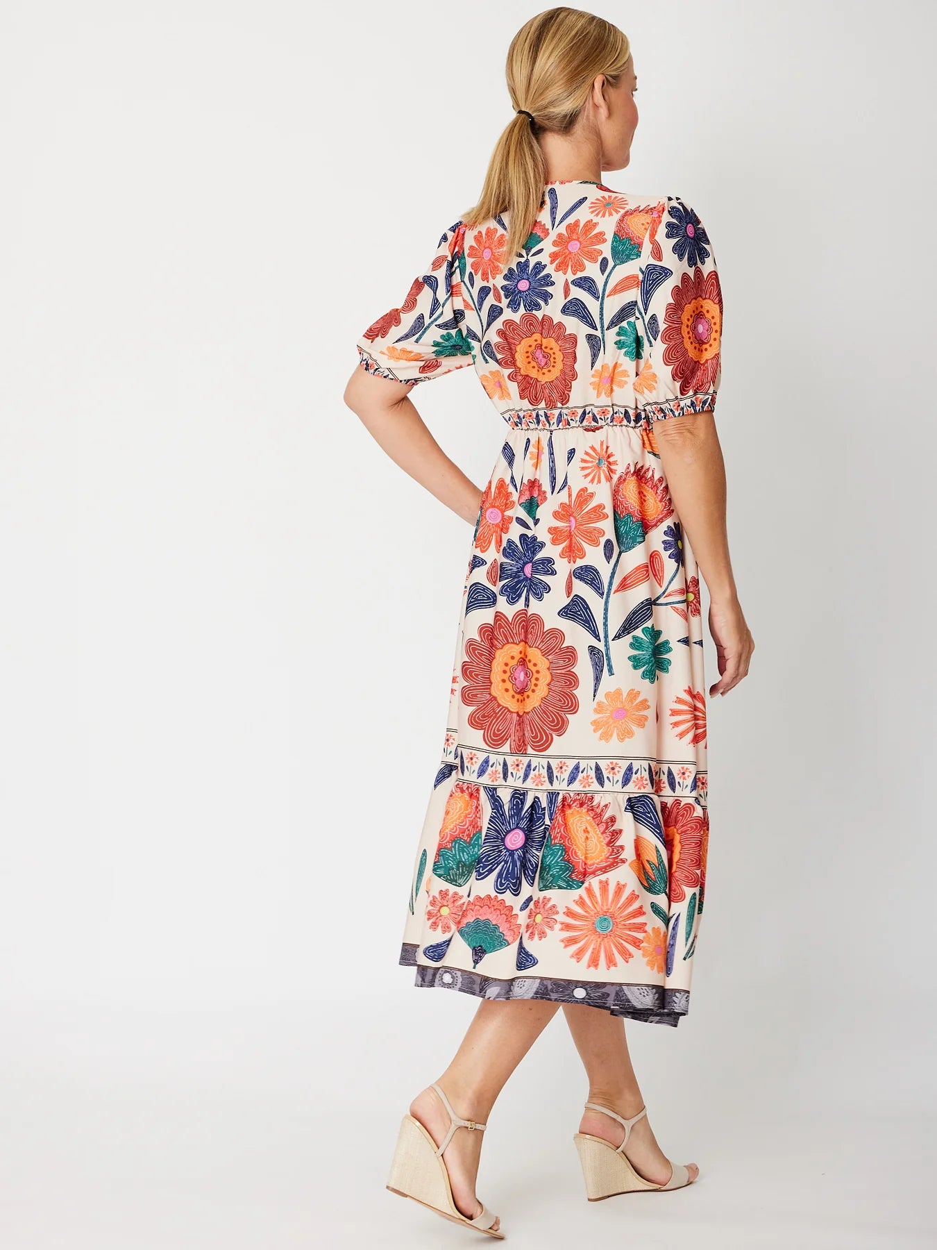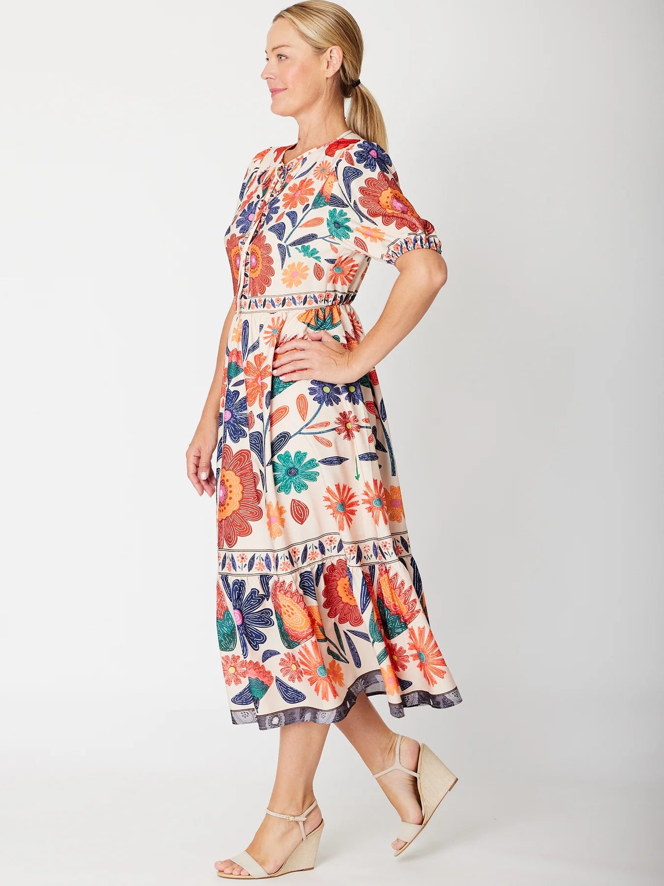 The Prairie Flower Dress offers effortless style with its longer short sleeves and flattering midi length. Crafted from soft rayon, it features a unique tie-neck detail that adds a touch of elegance to your look. Designed to fit true to size, Buy your bust measurement for the perfect fit as the fabric is non-stretch. This dress easily transitions from day to night, making it a standout choice for your wardrobe.