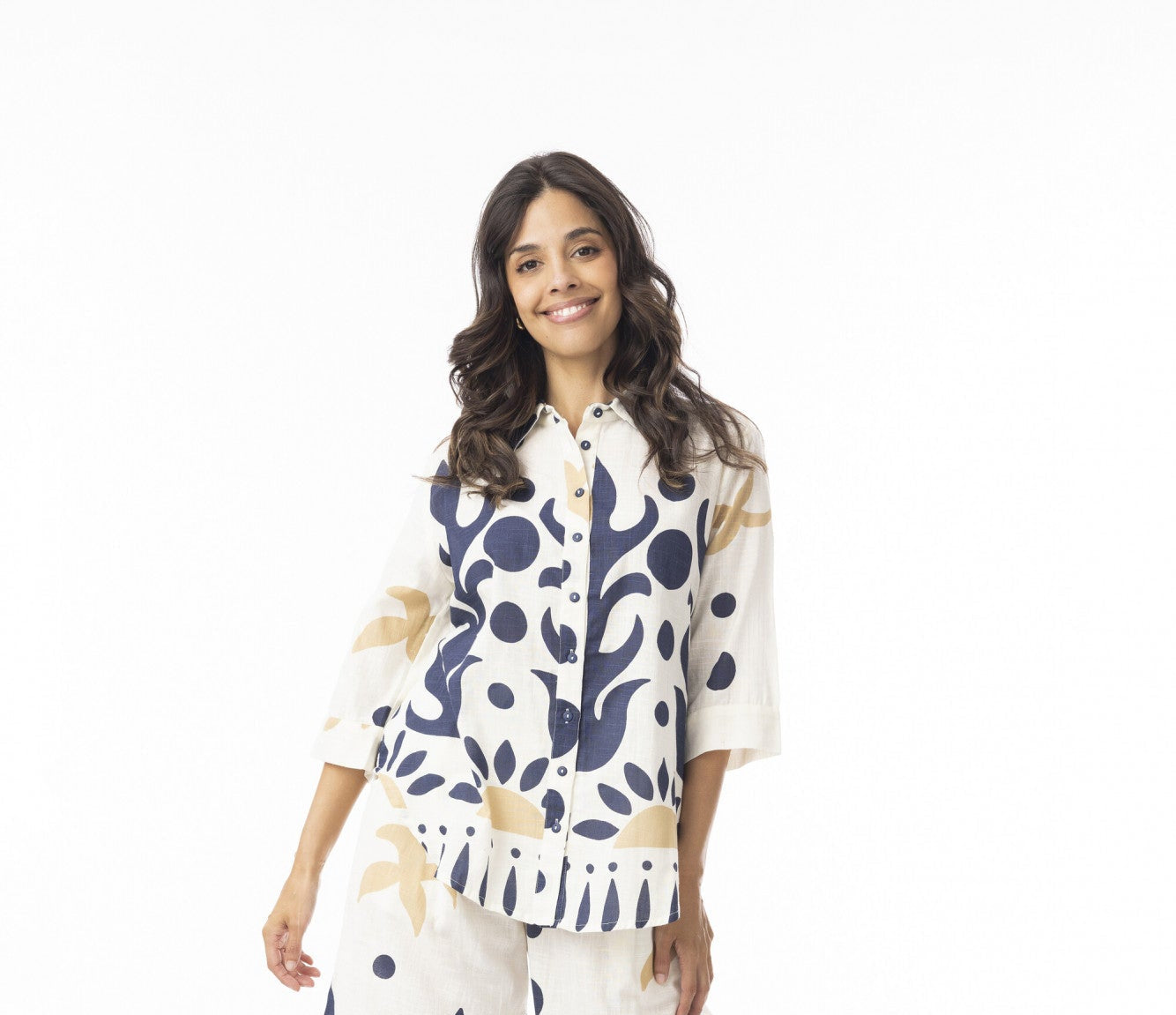 Add some fun to your everyday style with our Nazca Collar Top. Featuring relaxed three-quarter sleeves and a classic collar, this shirt boasts vibrant prints that make a bold statement. Perfect for casual days or dressing up, its comfortable fit and eye-catching design ensure you stand out in style.