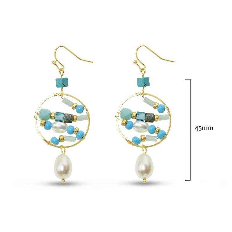 Beaded wire with fresh water pearls and natural stones pierced fish hook earrings in Gold/Turquoise Tone